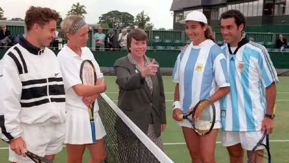 Argentina e Inglaterra volvían a encontrarse en el Mundial de Francia 1998 por primera vez después de la cita mundialista de 1986. El 30 de junio, en Saint Étienne, el choque por los cuartos de final quedó en manos del equipo que dirigía Daniel Passarella en una intensa definición por penales. Igual de emocionante fue el 2-2 en tiempo reglamentario que tuvo la expulsión de David Beckman tras quedar tendido en el césped por la marca de Diego Simeone. Un golpecito corto con su tobillo derecho, desde el suelo, fue condenatorio para el inglés. Wimbledon se jugaba en Londres durante esa semana. El día de enfrentamiento Argentina-Inglaterra Mercedes Paz, junto a Pablo Albano, debutaban en dobles mixtos. “Fue idea de los dos”, explicó la tucumana sobre el hecho de haber salido al sorteo con la camiseta argentina. Casualmente, el enfrentamiento era contra una pareja local, Julie Pullin y Danny Sapsford, a la que derrotaron por 6-1 y 7-6 (7-2). “Fue un toque de color. Ellos se reían”, recordó “Mecha” de aquel partido de tenis que se jugó en Inglaterra horas antes que el de fútbol en Francia.