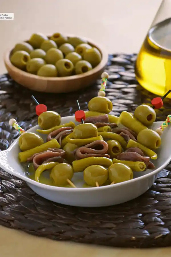 Montar cada pincho empezando con una aceituna, continuar con una porción de ají y ensartar después la anchoa doblada sobre sí misma. Continuar hasta terminar los pinchos y aliñar con un buen aceite de oliva, de manera generosa. Las aceitunas también pueden ser rellenas, si se gusta.