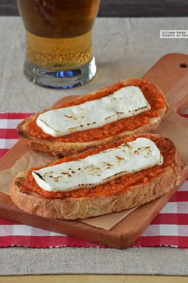 Colocar el queso sobre el pan y, opcionalmente, dar un golpe de soplete o gratinar en el horno justo antes de servir. Añadir un toque de pimienta negra recién molida, si se desea y alguna hoja verde picada, como perejil o cilantro y unas gotas de oliva.
