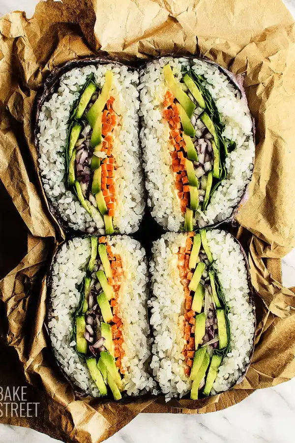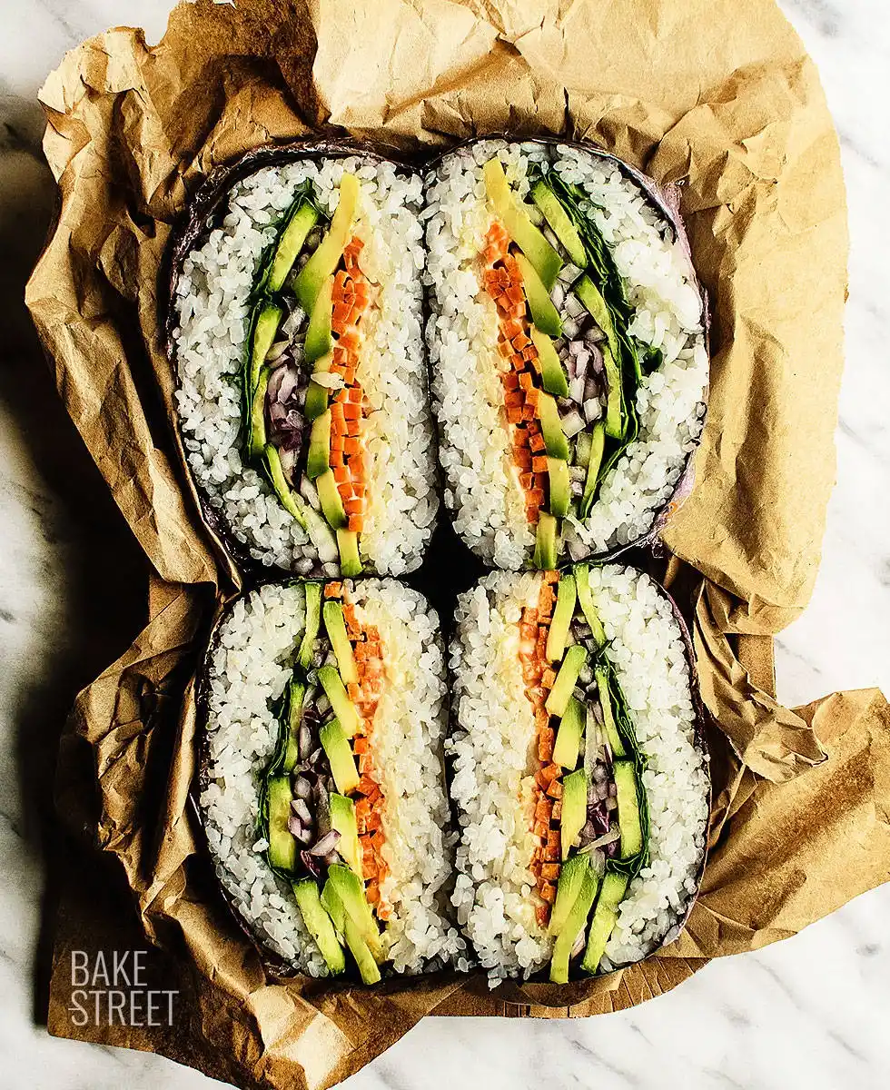 8. Doblar el alga nori y llevar cada una de sus esquinas al centro del emparedado. El arroz debe quedar envuelto por completo.