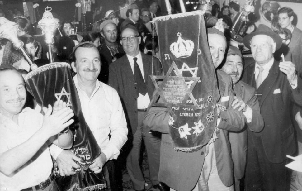 CELEBRACIÓN DE SIMJAT TORÁ. La alegría y la humildad se pinta en los rostros de los inmigrantes sefaradíes en esta imagen tomada en los años 1950.