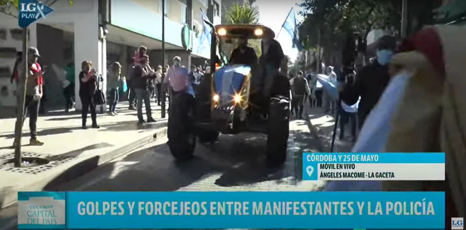 La movilización contra el presidente Alberto Fernández avanzó varias cuadras por calle 25 de Mayo, en el microcentro de la capital. Los manifestantes utilizaron un tractor y varios vehículos para sortear las vallas y las barreras humanas de la Policía.