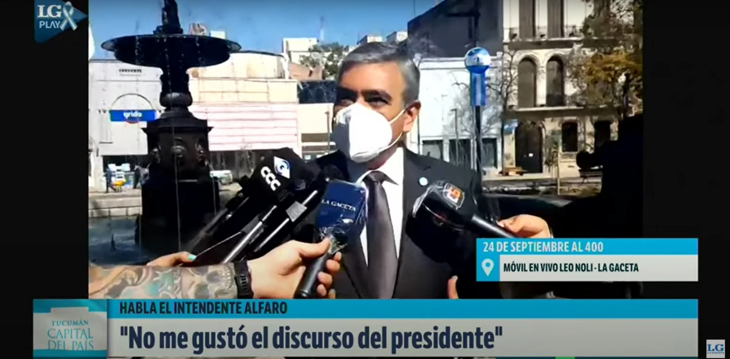 El intendente de la capital, Germán Alfaro, se dirigió a la renovada plaza Independencia, minutos después de haber participado en el acto oficial por el Día de la Independencia. En la Casa Histórica había escuchado los discursos del presidente Alberto Fernández y del gobernador Juan Manzur por la Independencia Argentina.