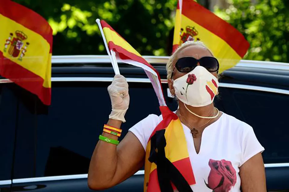 Una persona con una mascarilla ondea una bandera española durante una protesta en medio de la pandemia de 2020. AFP