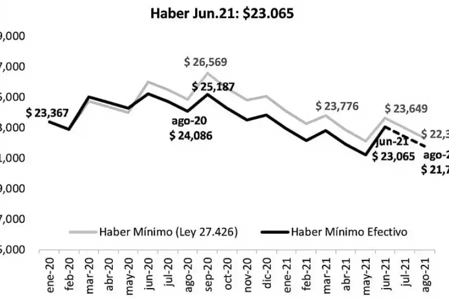 Si se considera a un jubilado que cobra el mínimo de $ 20.571, se observa un deterioro en su poder de compra respecto de la Canasta Básica Total en un 13,7% desde 2018 y en más de 42 puntos porcentuales de su valor máximo en 2013. Además, comparado con 2020 la caída fue del 7,7%.