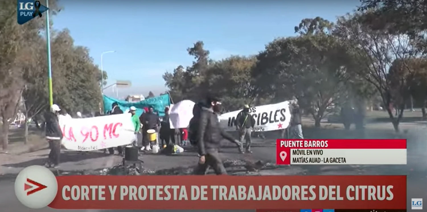 Trabajadores citrícolas autoconvocados cortaron los puentes Lucas Córdoba y Barros, que unen la capital con Banda del Río Salí y Alderetes, respectivamente. Los manifestantes reclaman a la Casa de Gobierno mejores condiciones laborales y la inclusión al programa interzafra, programa nacional que entra en vigencia desde octubre.