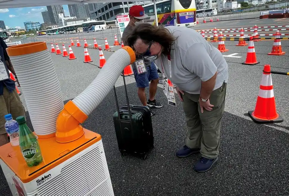 El calor y la humedad en la capital japonesa se parecen bastante a las de Tucumán en verano. Por eso, un hombre se refresca frente a un aire acondicionado portatil mientras espera el bus.