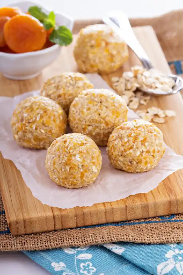 Procesar 1 taza de almendras tostadas hasta que estén bien molidas y reservar, aparte, la mitad; agregar al resto 1 taza de avena, 2 bananas grandes maduras "bañadas" en jugo de limón (así, además de conseguir sabor, minimizamos su oxidación), 1 ½ cucharadita de canela molida y ¼ cucharadita de jengibre molido. Volver a procesar hasta obtener una masa uniforme. Sacar de la máquina e ir tomando porciones para formar bolitas con ellas, haciéndolas rodar entre las palmas de las manos.