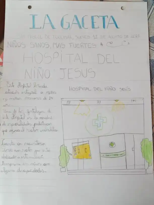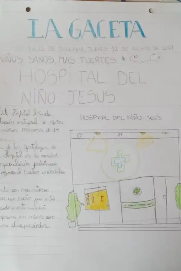 Una de las portadas diseñadas por los alumnos de Amaicha del Valle habla de la importancia de estar sanos para ser chicos fuertes. Y en ese sentido, averiguaron y detallaron cómo funciona el Hospital de Niños en la capital tucumana. Los pequeños también destacaron una nota que no se olvidan: el año pasado, en plena cuarentena y con las escuelas cerradas, ellos fueron noticia cuando su señorita Mirian Lera tuvo la idea de darles clases a través de un programa de radio en vez de mandar tareas por mensaje.