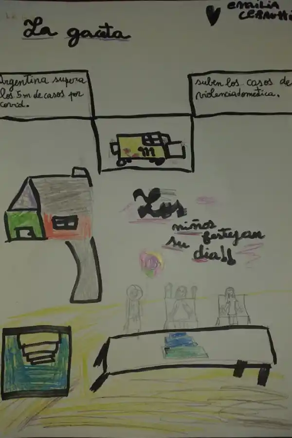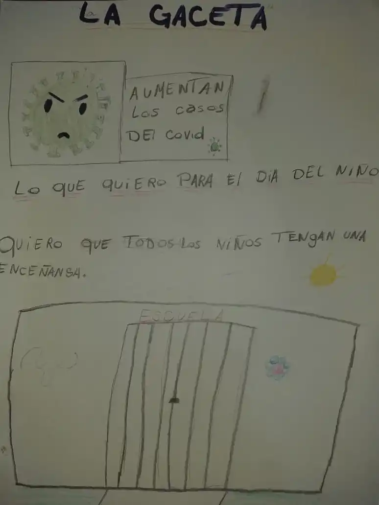 Valentina Miguez, de 10 años, alumna de la escuela Elmina Paz de Gallo, nos cuenta que se informa principalmente por las redes sociales y por internet. Sobre lo que ocurre en la actualidad, comentó: “me impactó que mueren muchas personas por covid-19. Eso me da tristeza”. La niña, que va a quinto grado, señaló mientras dibujaba su tapa de LA GACETA: “Lo que más quiero en este día del niño es que todos los chicos puedan tener una educación y así mejorar cada día”.