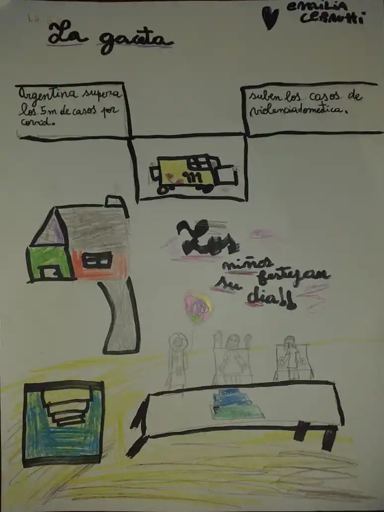 Eloisa Ramayo Hernández, la más pequeña de las miniperiodistas, supo desde un primer momento lo que quería: “hago esto porque voy a salir en LA GACETA”, lanzó sin vueltas apenas empezó a diseñar su portada del diario. Habló del coronavirus (al que odia, pero admitió que al mismo tiempo le gusta), de las clases virtuales, y de cómo ayudar a los pobres y a los chicos abandonados. “Hay que abrir una mansión para todos ellos y escuchar lo que tienen para decirnos”, propuso.