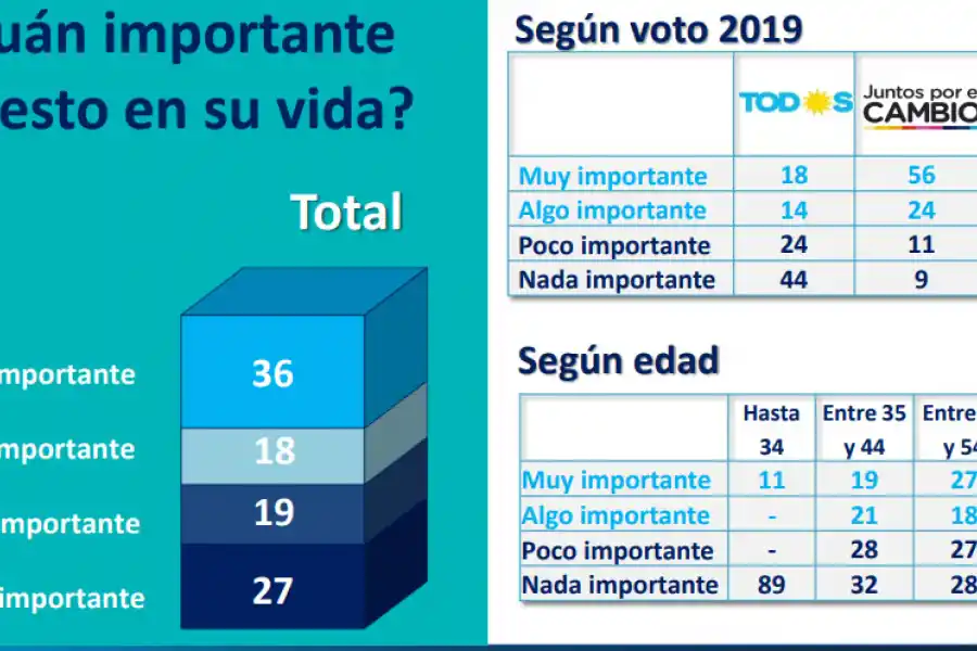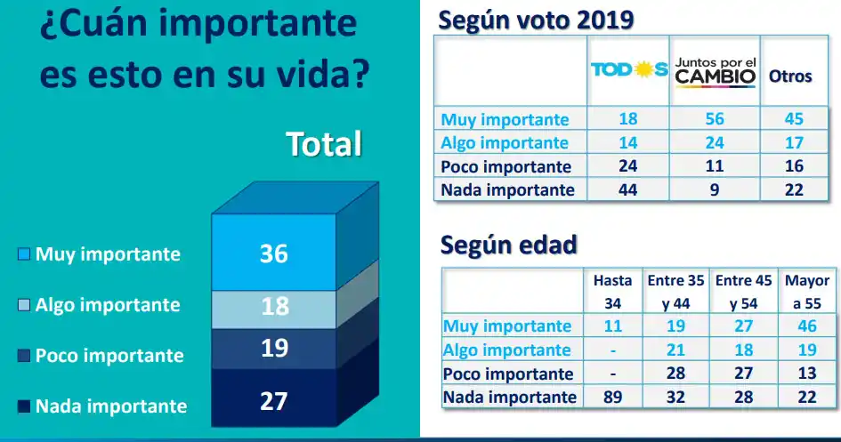 Al preguntar acerca la importancia de este hecho en sus vidas, el 54% considera que es importante (36% muy importante y 18% algo importante), porcentaje que crece al 80% en electores de Juntos por el Cambio en 2019; al 62% en los que optaron por terceras fuerzas y desciende al 32% en los que se inclinaron por el Frente de Todos. Además, a medida que aumenta la edad del entrevistado, crece este sentimiento, pasando de ser importante apenas para el 11% de los menores de 34 años al 65% de los mayores de 55 años.