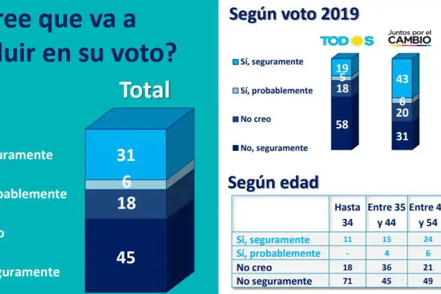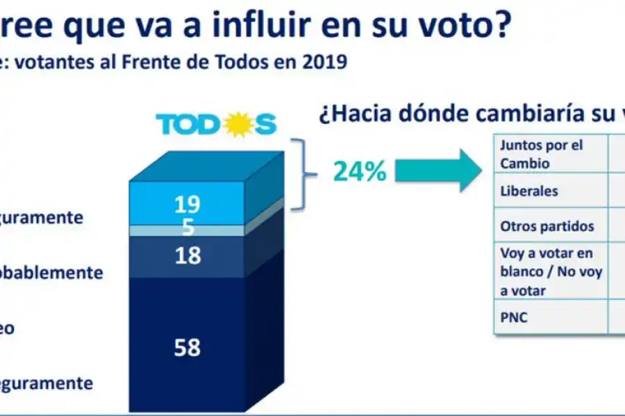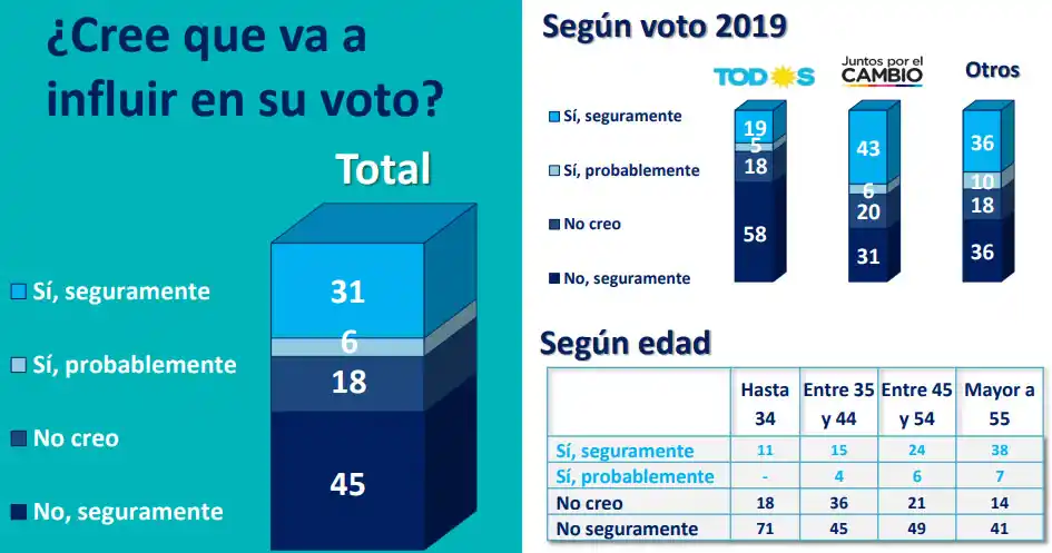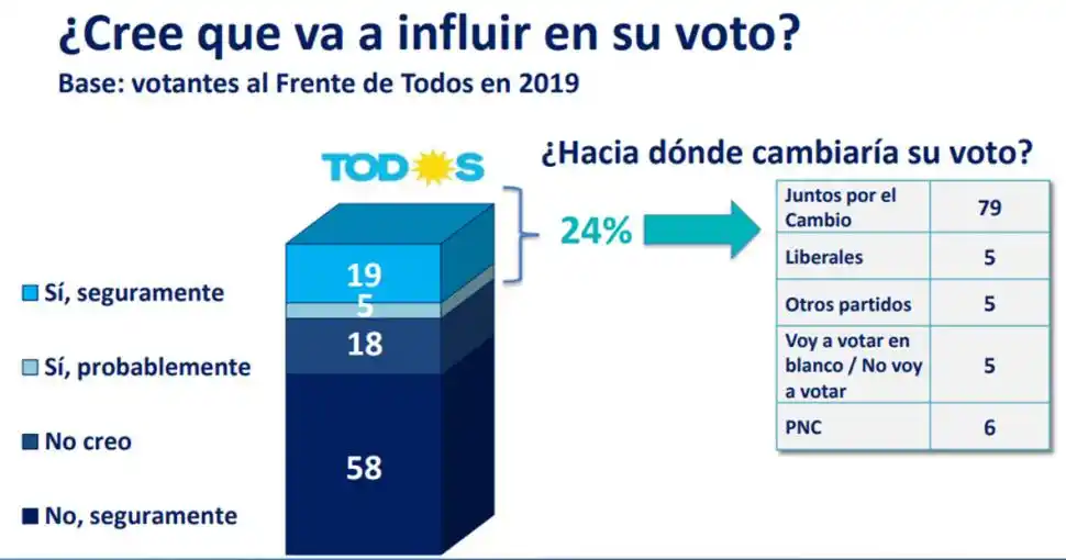 Consultados respecto de si este hecho influirá de alguna manera en su voto, el 37% cree que sí (seguramente 31% y probablemente 6%) contra el 63% que opina lo contrario, señala el sondeo al que accedió LA GACETA. Haciendo foco en los votantes del Frente de Todos, el 24% considera que impactará en su voto en las próximas elecciones y no repetirá su apoyo al oficialismo: el 79% se inclinará ahora por candidatos de Juntos, un 5% cambiaría su voto a Liberales, en igual proporción optaría por otros partidos, un 5% votaría en blanco o no iría a votar y un 6% prefiere no contestar.