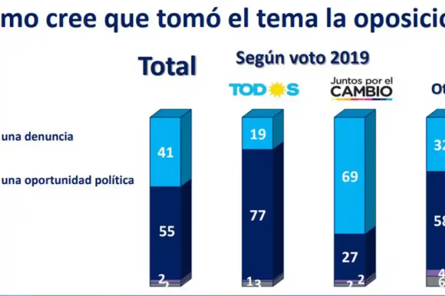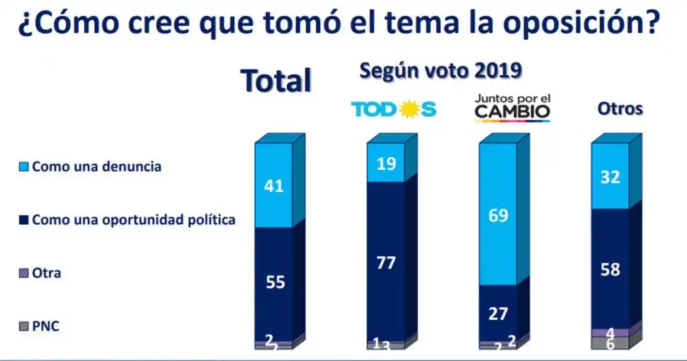Finalmente, el 41% cree que el tema fue tomado como una denuncia por la oposición mientras que el 55% opina que lo hizo como oportunidad política, percepción que alcanza al 77% de los oficialistas y apenas al 27% de los electores de Juntos por el Cambio en 2019.