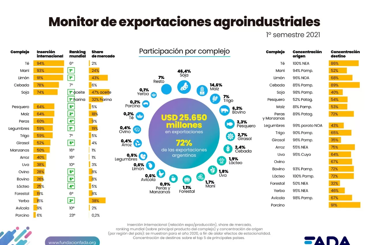 Exportar genera dólares. “En el primer semestre del año, las cadenas agroindustriales captaron U$S 25.600 millones por exportaciones, el 72% de todas las exportaciones del país”, señala Nicolle Pisani Claro, economista de FADA.