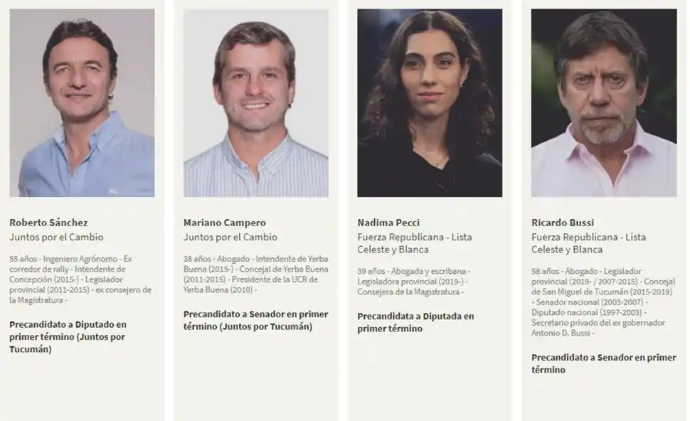 El 54,2% (13) de las 24 precandidaturas corresponden a funcionarios públicos con mandatos en curso, aunque las atinentes al Congreso de la Nación expirarán este año. Los legisladores provinciales dominan el terreno de postulantes con cargos políticos en el Estado. En ese grupo están Bussi y su compañera Nadima Pecci (Fuerza Republicana); Federico Masso (Frente Amplio por Tucumán) y Juan Antonio Ruiz Olivares (Frente de Todos-Lista “Todos por Tucumán”). En un segundo escalón aparecen empatados los intendentes y los parlamentarios nacionales. Pertenecen al primer segmento Germán Alfaro de San Miguel de Tucumán (“Juntos para Construir”), y los aliados Roberto Sánchez de Concepción y Mariano Campero de Yerba Buena (Juntos por Tucumán). Integran el sector de legisladores de la Nación los actuales diputados José Cano (“Cambiemos Juntos”) y Pablo Yedlin (“Lealtad Peronista”), y la senadora Silvia Elías (“Cambiemos Juntos”).