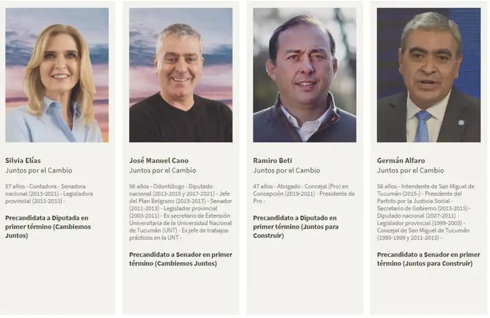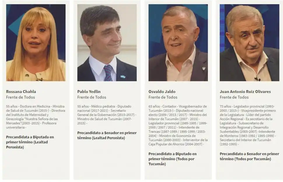 El cuadro de autoridades del Estado en funciones situadas al frente de las listas se completa con el vicegobernador Osvaldo Jaldo (“Todos por Tucumán”), la ministra provincial Rossana Chahla (Lealtad Peronista) y Beti, que es el único edil que logró un lugar en el tope de la nómina. José Vitar (Frente Grande) y Daniel Blanco (Política Obrera) forman parte del conjunto de candidatos que ocuparon cargos públicos electivos: el primero fue diputado -además, desempeñó roles en los gobiernos provincial y nacional- y el segundo, convencional constituyente en 2006.