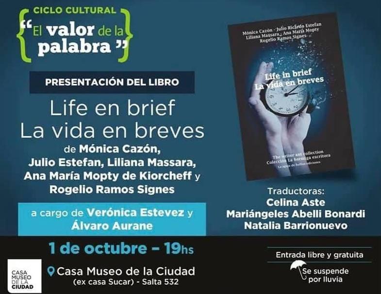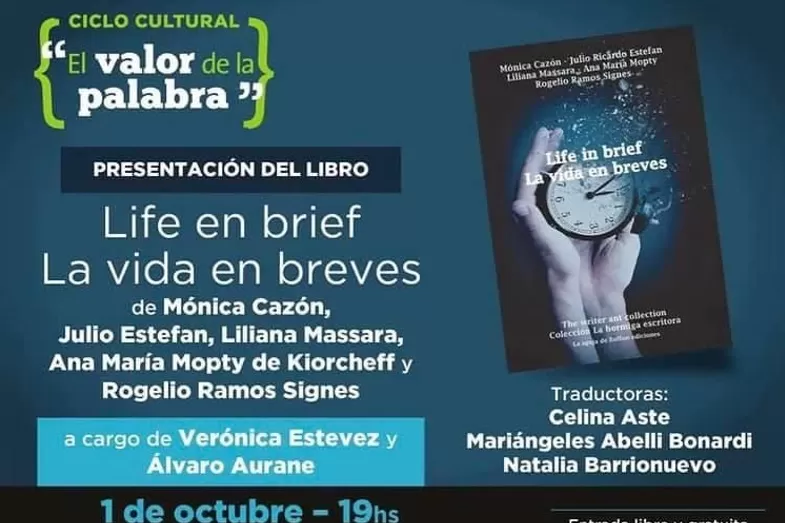 Publicado por la editorial “La aguja de Buffon Ediciones”, el libro reúne microrrelatos de Mónica Cazón, Julio Estefan, Liliana Massara, Ana María Mopty de Kiorcheff y Rogelio Ramos Signes, traducidos al inglés por Celina Aste, Mariángeles Abelli Bonardi y Natalia Barrionuevo. La coordinación y dirección pertenecen a Mopty y Cazón. Y la conducción estará a cargo de Verónica Estevez y Álvaro Aurane.