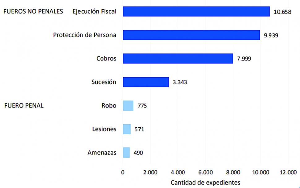 Sólo después aparecen las medidas vinculadas con la protección de personas, como las restricciones de acercamiento. Si bien son dispuestas mayormente por los juzgados de Familia (por ello se encuentra en el campo estadístico de los “Fueros no penales”), pueden tener un correlato penal. Pero la cifra es menor que el de los procesos de ejecuciones sumarias iniciados contra deudores de tributos.