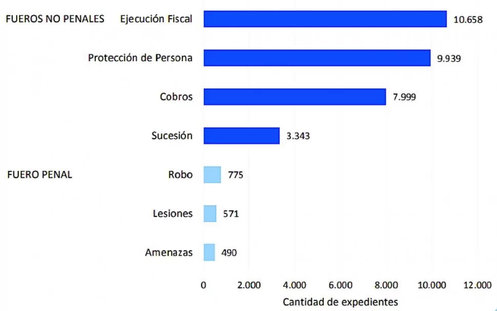 De hecho, los expedientes netamente penales se encuentran a distancias siderales respecto de los que se han detallado. Los procesos ingresados por “Robos” entre febrero y la semana pasada suman apenas 775. Los expedientes referidos a “Lesiones” totalizan 571. Y los vinculados con “Amenazas” ni siquieran alcanzan los 500.