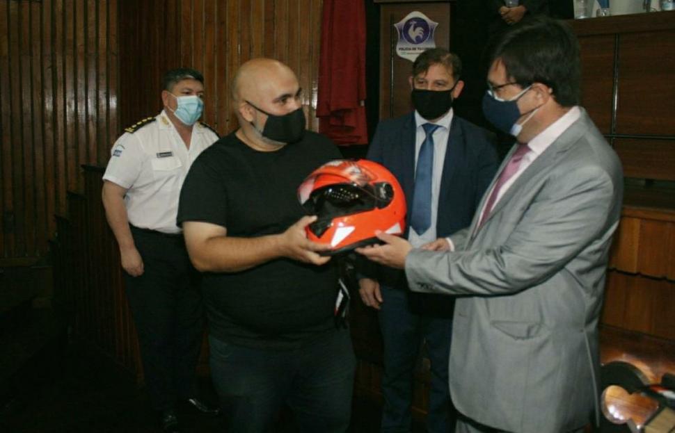El ministro de Seguridad de la provincia, Eugenio Agüero Gamboa, junto al secretario de Transporte, Benjamín Nieva, entregó 100 cascos y 100 chalecos reflectivos a trabajadores de delivery. “Entregamos 100 cascos para los trabajadores de delivery en el marco de un trabajo que realiza el Ministerio de Seguridad, a través de la Secretaría de Transporte, en conexión con la Agencia Nacional de Seguridad Vial. Cada accidente implica al menos cuatro efectivos trabajando en el lugar, a los que se suman luego personal de Criminalística y de otros equipos policiales. Si logramos minimizar los accidentes viales, también se minimizan los gastos en Salud para que puedan destinar esos recursos a proyectos”, señaló el ministro Agüero Gamboa, quien aseguró que continuará las próximas semanas con la entrega de cascos, brindando capacitaciones de concientización vial.