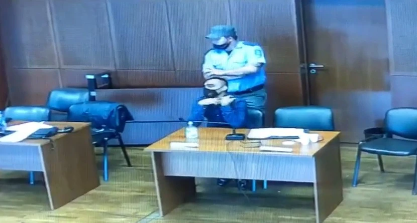 El gesto que hizo el acusado quedó grabado por las cámaras del Poder Judicial. En el video puede verse el instante en que Visuara mira a Nicolás, quien además de ser hijo de Dominé es querellante en la causa, y se pasa un dedo por el cuello.