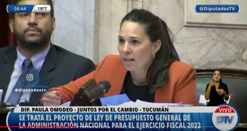 En su exposición en el recinto, la diputada por Juntos por el Cambio, Paula Omodeo, afirmó que "no va a acompañar este proyecto". "Pretender que en 18 horas se revise una modificación de 16 artículos habla de cuál es el concepto que tiene el Poder Ejecutivo sobre el rol de esta Cámara. Si mandan un proyecto que estuvo parado más de tres meses y luego quieren que en poco tiempo se analicen todos los artículos, me parece una falta de respeto", disparó durante su discurso.