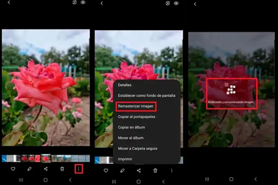 Hacerlo es muy fácil: en la galería, tenés que seleccionar la foto que deseás mejorar y hacer clic en los tres puntos que figuran en el borde inferior derecho. Allí se desplegará un menú de opciones; apretá la opción “remasterizar imagen”. Inmediatamente iniciará un escaneo de la fotografía y la IA reconstruirá los pixeles de la imagen para brindarle mayor nitidez. Vas a saber que la foto se está procesando porque una serie de cuadrados aparecerán en la parte central de la pantalla. Una vez finalizado el proceso, podrás ver una línea vertical que separa el antes y el después de la imagen; la línea se mueve e incluso podrás acercar la fotografía para visualizar las diferencias de nitidez. Si estás de acuerdo con los cambios, deberás hacer clic en “guardar”, para que la foto se actualice a la nueva versión. Esta opción sirve con fotos de baja resolución (quizá tomadas con el dispositivo), descargadas de internet o imágenes analógicas que han sido digitalizadas.