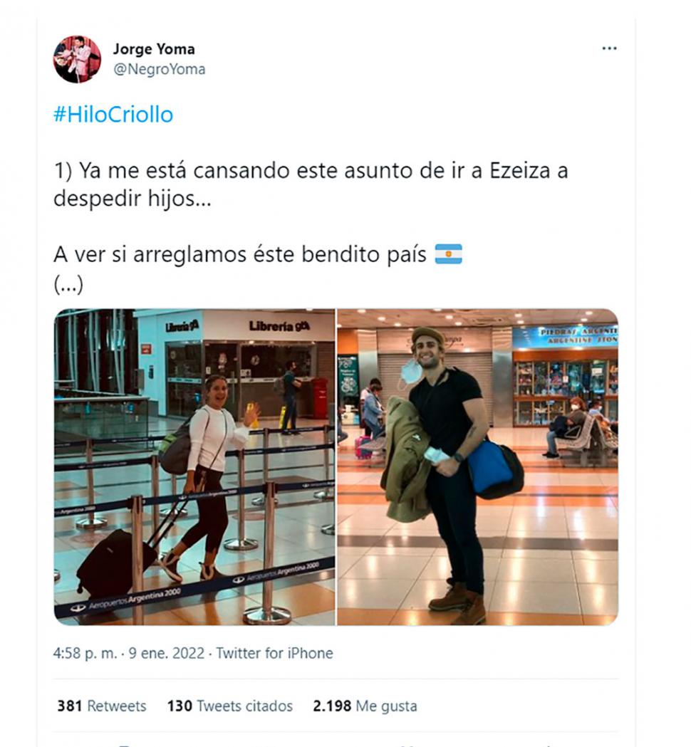 “Ya me está cansando este asunto de ir a Ezeiza a despedir hijos... A ver si arreglamos este bendito país”, tuiteó el ex senador peronista Jorge Yoma (@NegroYoma).