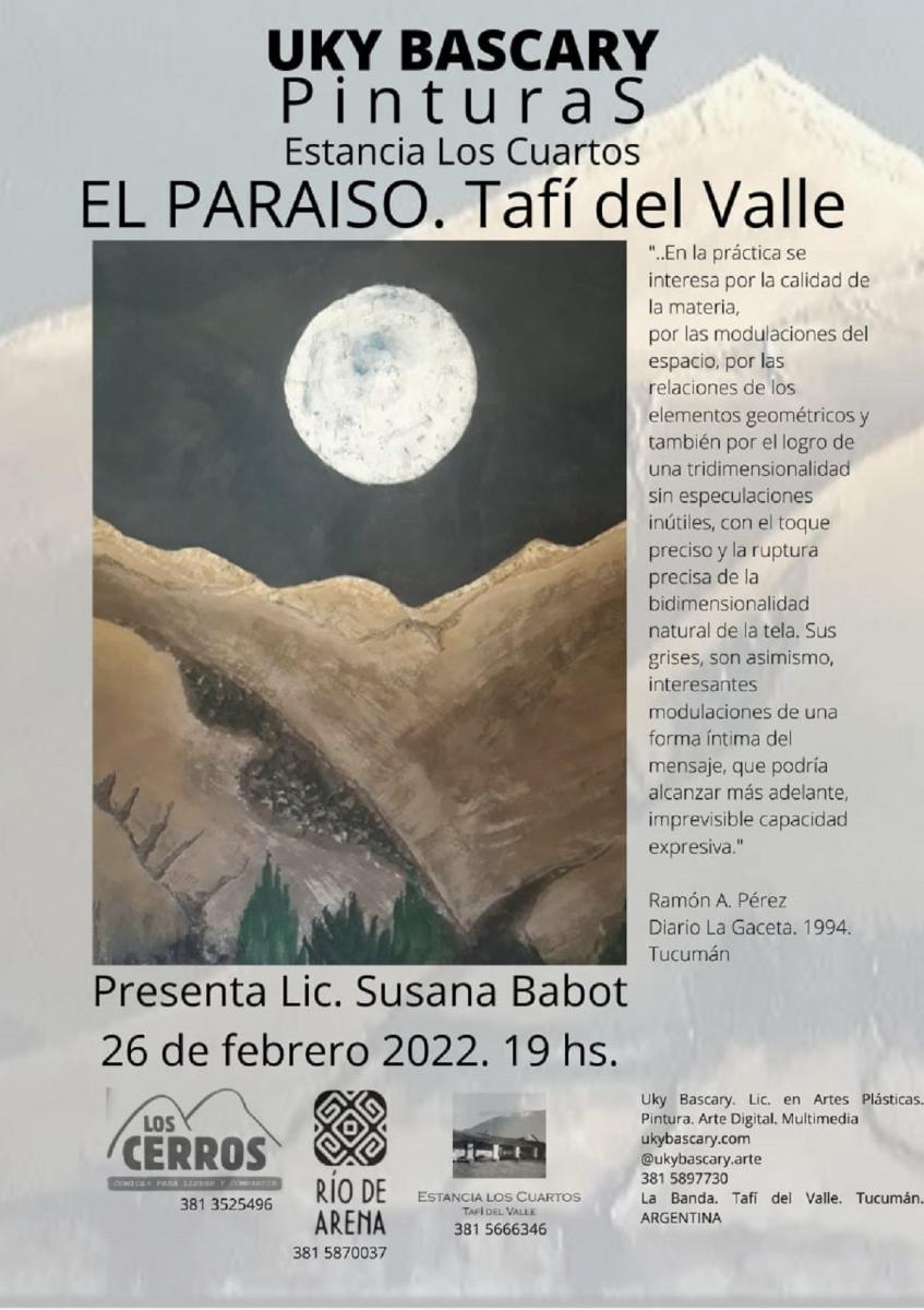 Este sábado a las 19, en la estancia Los Cuartos, de Tafí del Valle, se presentará una exposición de pinturas de la licenciada en Artes Plásticas Uky Bascary. La presentación estará a cargo de la licenciada Susana Babot.