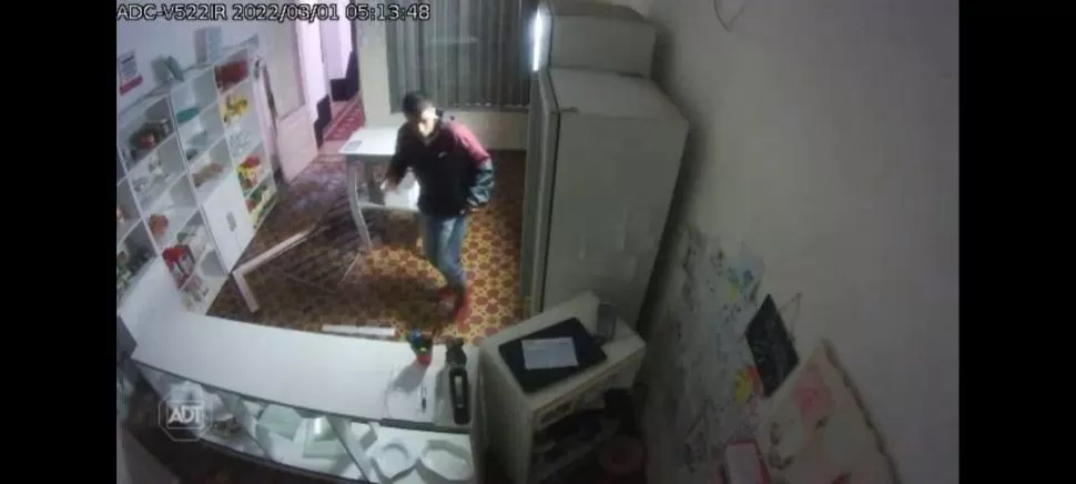 El video registrado por la cámara de seguridad es desolador. Se puede apreciar cómo uno de los dos jóvenes, que tiene tapada la cara con una capucha, rompe primero el vidrio y después la puerta. Ingresan los dos. Uno se dirige a la cocina y se lleva la cortadora. El otro, que actuó con la cara descubierta, se quedan con los elementos. En las imágenes queda demostrado que los delincuentes tardaron 18 segundos en tomar las cosas y escaparse. Y hubo una demora porque uno de ellos se cayó al suelo, pero jamás soltó el botín.