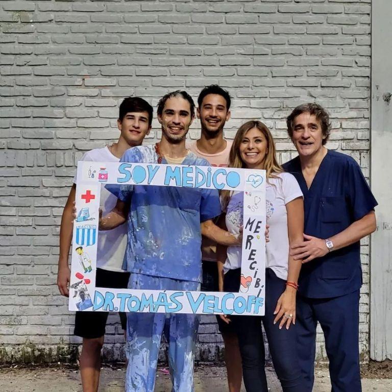 Además, no faltó el recuadro para selfies con algunas imágenes relacionadas a la medicina y el escudo de Racing, club del que son hinchas. “Soy médico, me recibí. Dr. Tomás Velcoff”, se puede leer.