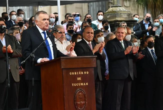 El vicegobernador a cargo del Poder Ejecutivo (PE), Osvaldo Jaldo, abrió la serie de discursos durante el acto oficial presidido por el presidente Alberto Fernández. Frente a la fila de policías de la provincia y de los nuevos móviles, el Gobernador interino agradeció de manera calurosa las presencias del mandatario nacional, del jefe de Gabinete, Juan Manzur, del ministro de Seguridad, Aníbal Fernández, y del presidente de la Cámara de Diputados, Sergio Massa, entre otras autoridades estatales.