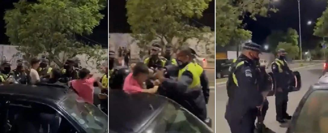 En determinado momento, un grupo de uniformados reaccionó contra un joven que conducía el automóvil y uno de sus acompañantes. Los jóvenes recibieron bofetadas y golpes varios, mientras sus amigos filmaban la situación.