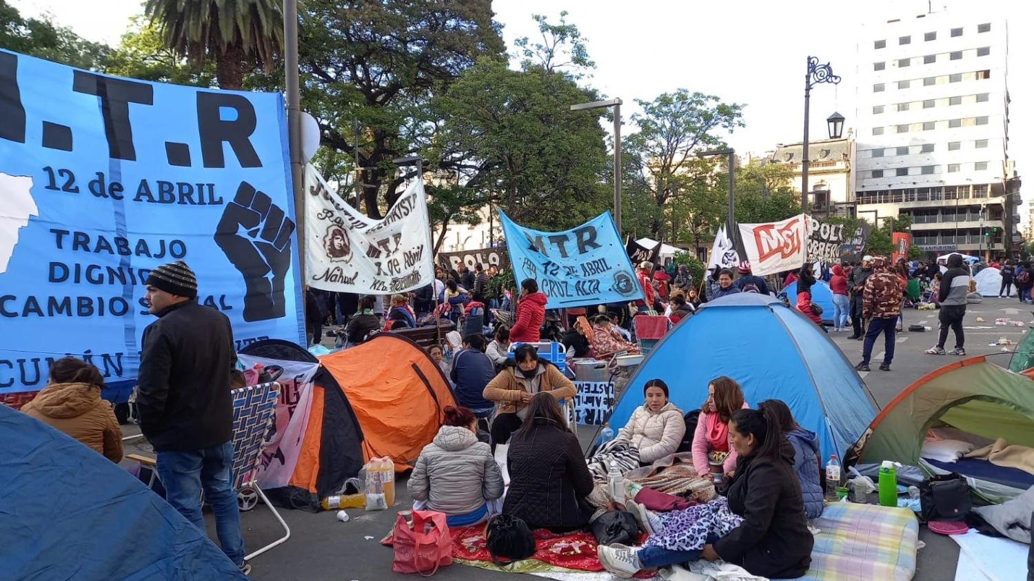 Los manifestantes pasaron la noche fría en las carpas, instaladas frente a la Casa de Gobierno. Allí expresaron sus reclamos, centrados la provisión de alimentos para los comedores barriales, trabajo para los jóvenes y en contra de los aumentos de precios.