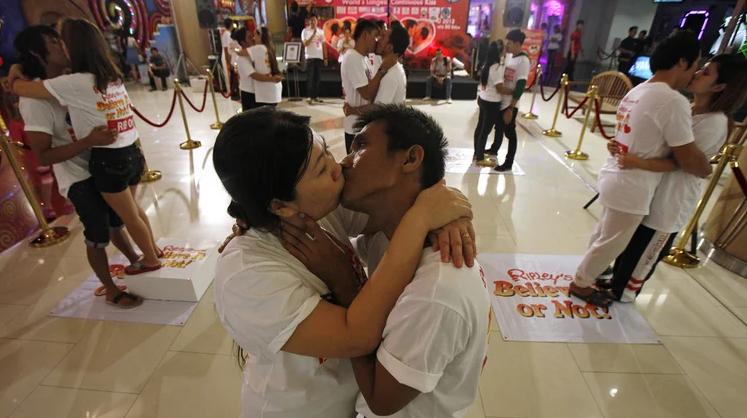 El matrimonio tailandés Ekachai y Laksana Tiranarat se besó durante 58 horas, 35 minutos y 58 segundos y logró ingresar al Libro Guiness de los Records por el beso más largo de la historia.