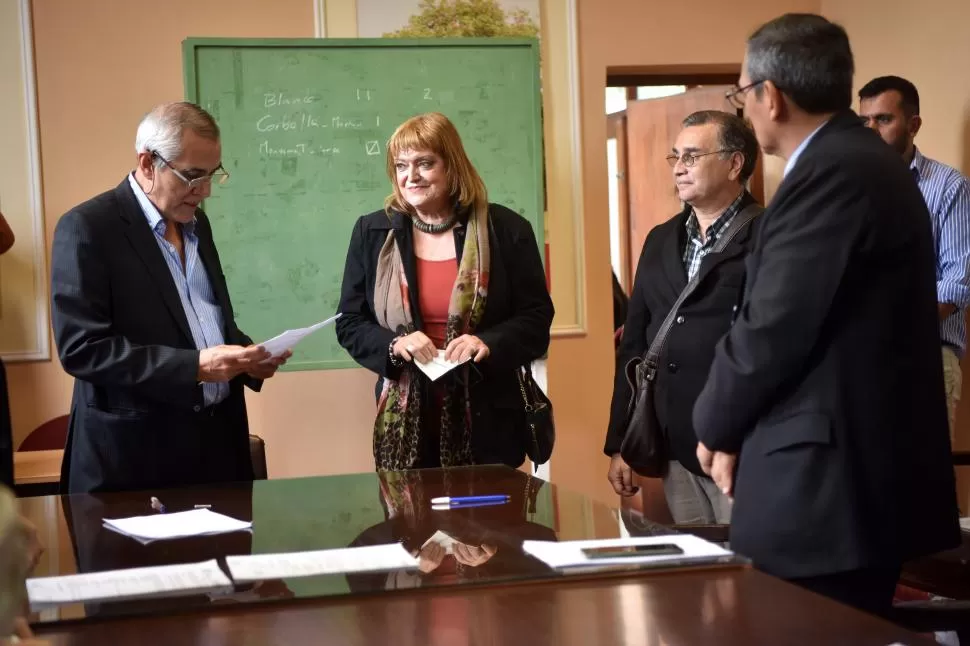 Susana Monserrat escucha la lectura de la resolución de la Junta Electoral. Fue elegida para conducir la unidad académica de la cual salió el rector, José García. Osvaldo Arce es el Vicedecano.