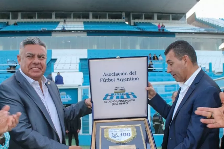 El presidente de la Asociación del Fútbol Argentino (AFA), Claudio "Chiqui" Tapia, recibió este sábado una plaqueta y una camiseta de Atlético Tucumán, en el marco de los festejos por el centenario del estadio "Monumental José Fierro".