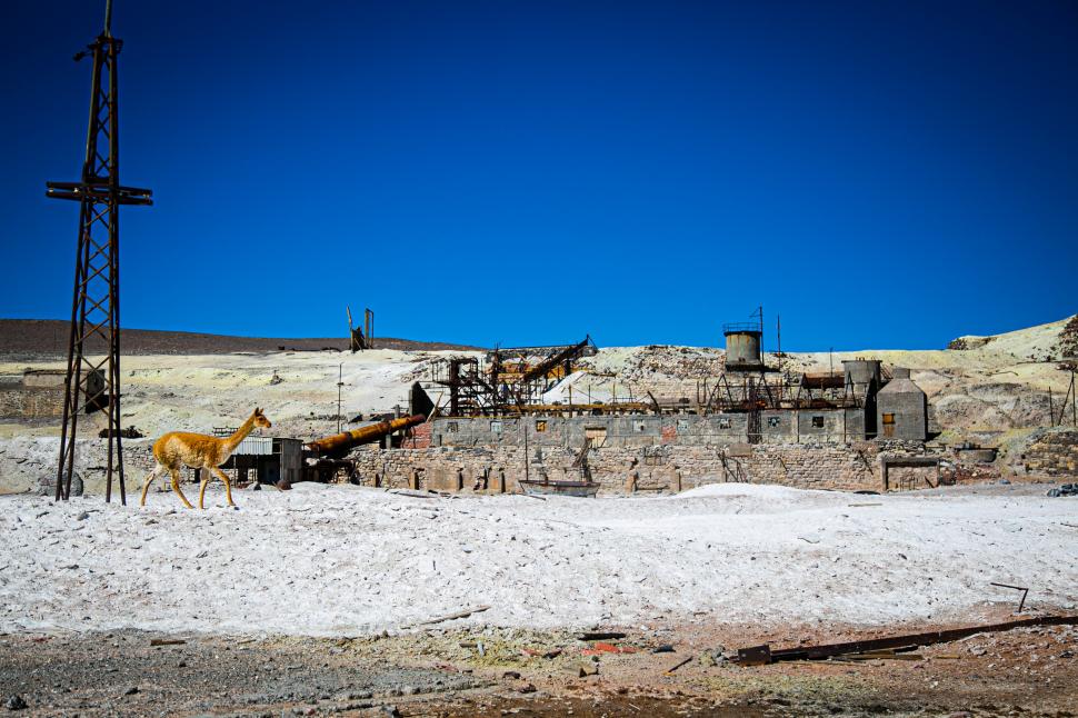 Algunas vicuñas se agrupan en el lugar, caminan sobre relaves -restos de la concentración del azufre que forman montículos de polvo amarillento- y beben agua de una fuente que brota en el centro de las ruinas. “Fue un baqueano el que encontró la vega -surgente de agua dulce- que dio lugar al establecimiento del pueblo azufrero en este punto”, relata Norte. “Cuando fue a declararla dijo que la encontró por casualidad, así que el nombre de la Azufrera y del pueblo provienen de esta expresión”, añade.