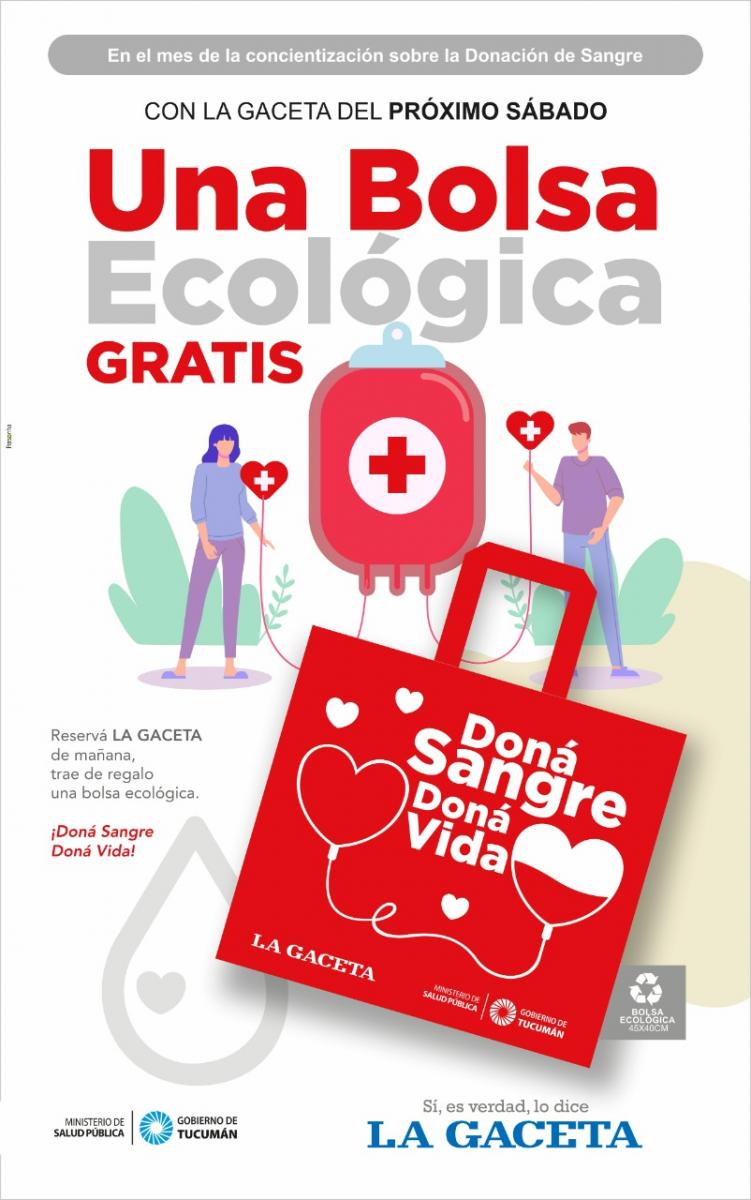 Junto al Gobierno de Tucumán y el Ministerio de Salud de la provincia, LA GACETA quiere regalarte una bolsa ecológica con la compra de tu diario el próximo sábado 18 de junio, el acto de donar no perjudica tu salud, así que anímate y doná, para que el mundo siga latiendo
