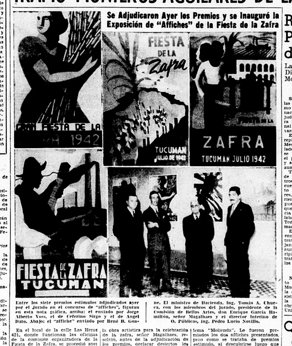 Estamos en junio de 1942. Tucumán se estaba preparando para un evento antes nunca visto. Se estaba disponiendo todo para la realización de la Primera Fiesta de la Zafra. Las calles se iban preparando para los distintos eventos. El parque 9 de Julio estaba siendo engalanado para que allí se realicen los actos centrales. Uno de las acciones iniciales fue la organización de un concurso de afiches para encontrar a aquel que represente de la mejor manera la trascendencia de la fiesta que se estaba preparando. De acuerdo a nuestro diario: “los afiches premiados correspondieron a los siguiente artistas, René Goane, presentado con el lema ‘Surco’; Angel Dato, con el lema ‘Molienda’”. Agregaba que también fueron premiados Ceferino Sirgo (“Chumbo”), Salvador Luna (“Potencia”), Jorge Alberto Voss (“Tañica”) y Elda Moreno (“Pochocha”)”. El jurado a cargo de la selección estaba compuesto por Enrique García Hamilton (presidente de la Comisión Provincias de Bellas Artes), Pedro Lucio Novillo (director interino del Departamento de Obras Públicas) y el director del concurso, Magalhaes. Debido a una confusión en cuanto a la técnica del trabajo que disponía que tenían que emplearse tres colores planos y se “han empleado tres o más colores” podrían declararse desierto los premios. No obstante ello la comisión determinó crear siete premios estímulo a los siete mejores trabajos.