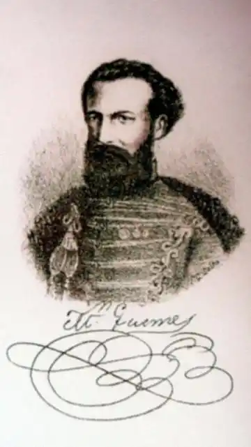 “El primer retrato que se hizo de Güemes fue realizado por el plástico francés Ernest Charton, quien estuvo de paso en Salta el año 1876 y lo hizo por encargo de Juan Martín Leguizamón. Al no haberse hecho ningún retrato en vida de Güemes, Charton tuvo que recrear el rostro. En ese retrato Güemes aparece con vestimenta de gaucho. Mientras que en el dibujo de Flavio García, Güemes está con uniforme de oficial porque se pretendía “un Güemes vestido de militar luciendo el regio uniforme con alamares”, dice el historiador Romero Sosa (1962).