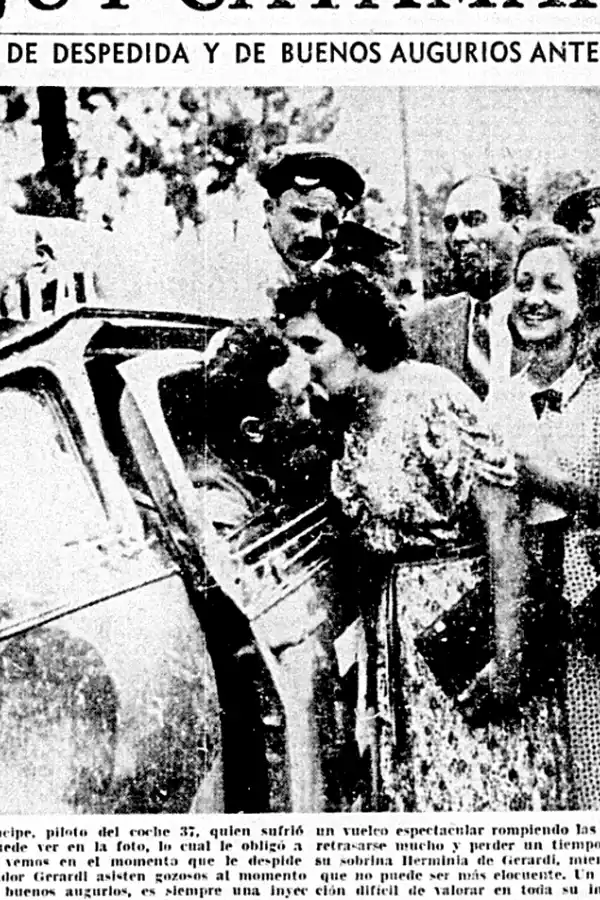 Arquatino Principe, piloto del coche número 37, sufrió un vuelco espectacular, que le rompió las puertas del coche y causó algunos otros desperfectos, tal como se puede ver en la foto. Ello lo obligó a retrasarse mucho y a perder tiempo precioso. La foto muestra el momento en que lo despide su sobrina, Herminia de Gerardi, mientras María Esther Gerardi y Salvador Gerardi asisten gozosos al momento. Un beso de despedida y de buenos augurios es una inyección anímica difícil de valorar en toda su importancia. Cómo siguió la prueba para Principe fue un misterio. En las clasificaciones de las etapas posteriores se pierde su rastro; quizás en el complicado paso por los arenales sanjuaninos haya quedado detenido. Tal vez en el largo tramo entre San Luis y Bahía Blanca su coche no haya podido aguantar más el duro trajín. El Gran Premio Extraordinario que se inició con 125 competidores terminó con poco más de 40; él estuvo entre los que abandonó.
