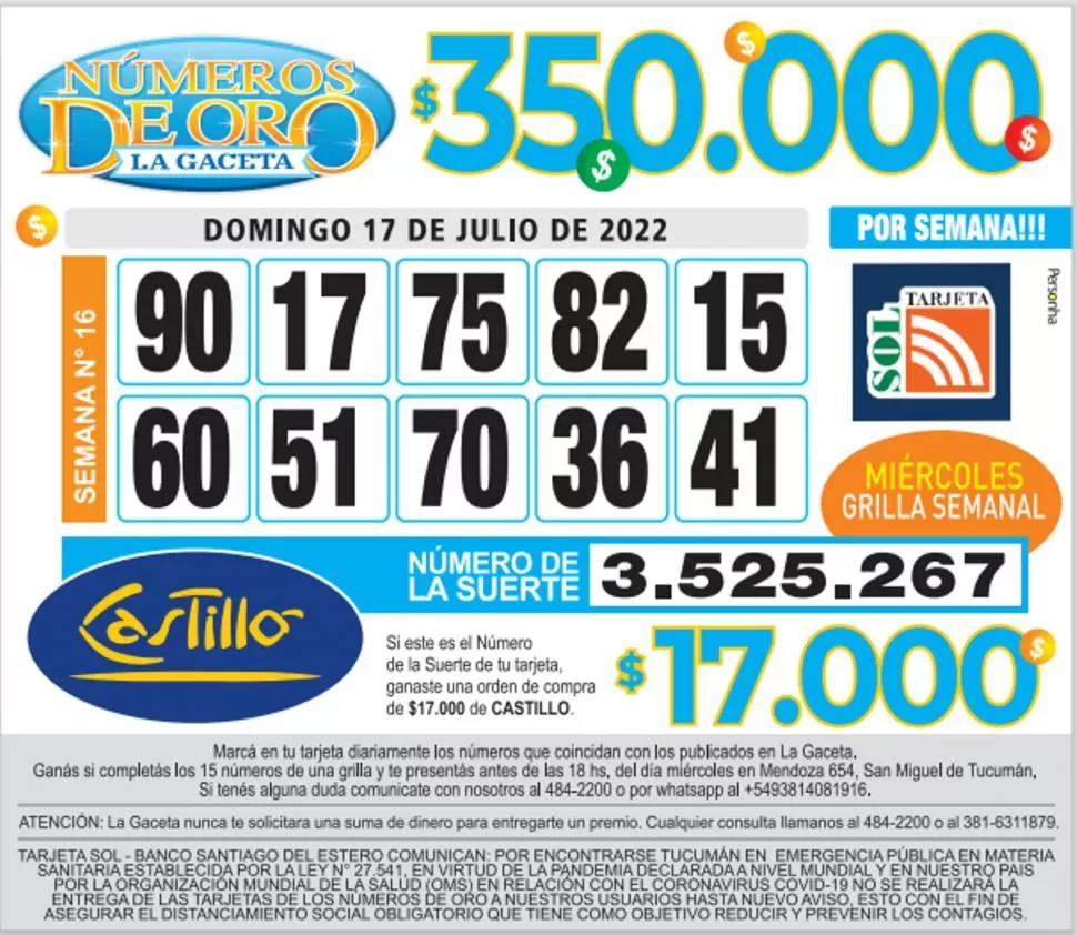 Números de Oro Los Números de Oro de LA GACETA Compartir Whatsapp Facebook X Copiar dirección URL 17 Julio 2022 Seguir en Esta nota es de acceso libre. Tamaño texto Comentarios Lo más popular Elecciones en la UNT: contundente apoyo de decanos a Sergio Pagani y Mercedes Leal Alerta por heladas y lluvias para el fin de semana largo: qué provincias sentirán más el cambio de tiempo Crimen en el country: ¿perpetua o emoción violenta para Figueroa? Anses confirmó un bono para jubilados en mayo 2026: ¿quiénes lo cobran y cuánto recibirán? Jaldo propone que el Estado deje de financiar las PASO Ranking notas premium Jaldo se ubica en el centro del cuadrilátero político “Rape academy”: qué muestra la investigación de CNN sobre la cultura de la violencia sexual