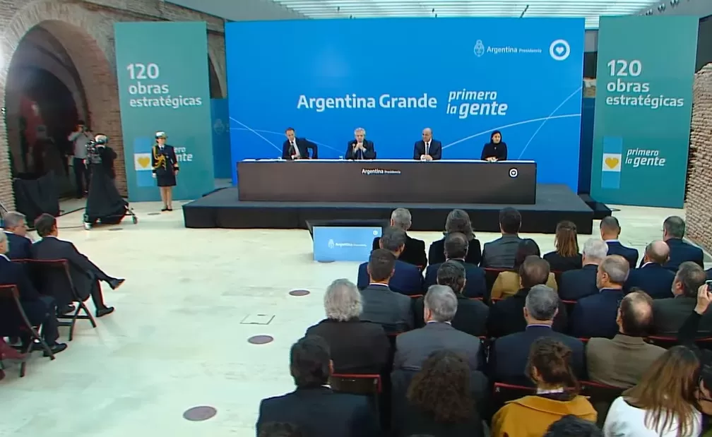 El presidente Alberto Fernández, junto al Ministro de Obras Públicas, Gabriel Katopodis, y al jefe de Gabinete, Juan Manzur, anuncia este lunes siete de los 120 proyectos enmarcados en el programa "Argentina Grande".