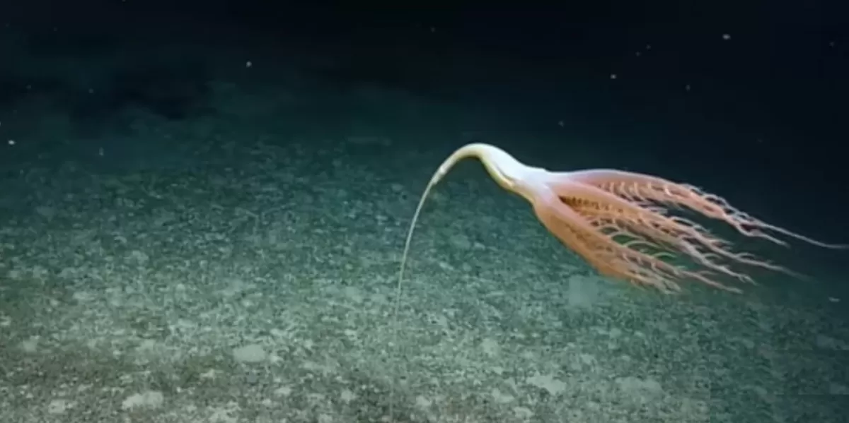 En el océano Pacífico un grupo de científicos captó imágenes que muestran una gigantesca y peculiar criatura marina con tentáculos flotando lánguidamente en las profundidades han hecho que los investigadores se pregunten es real o no, ya que se trataría de una nueva especie.