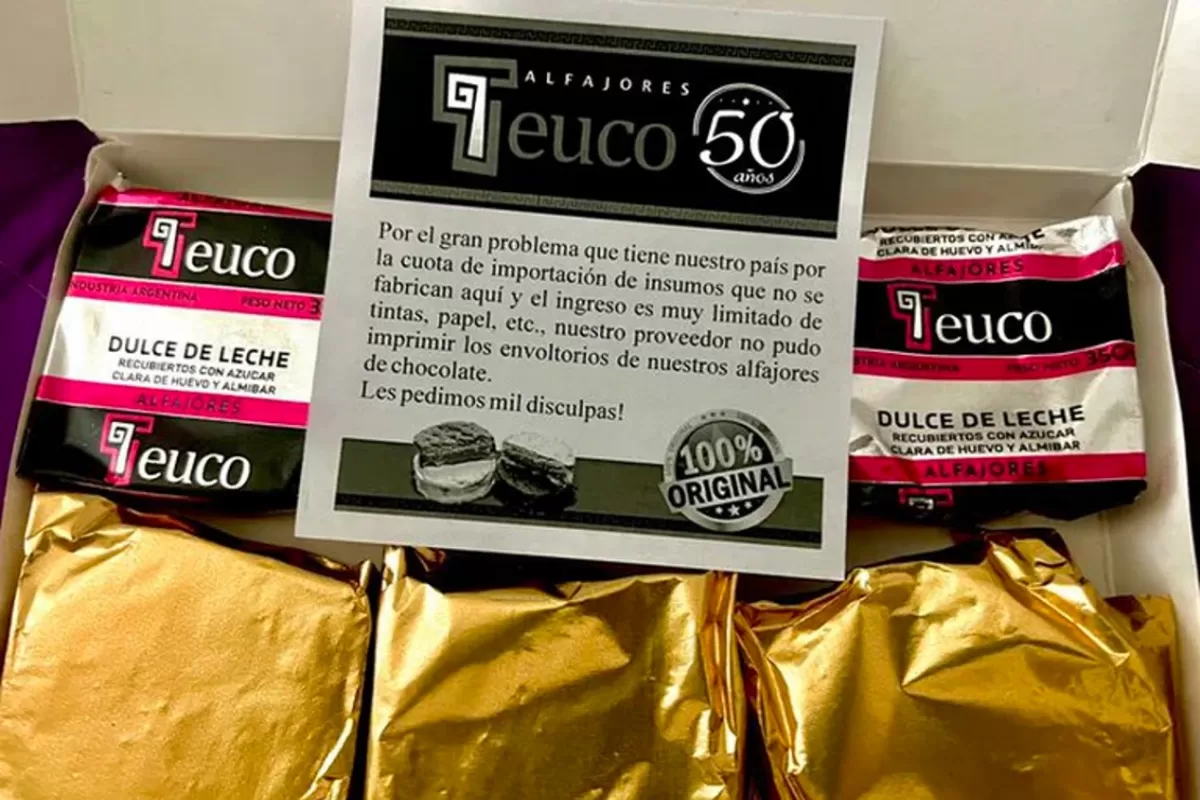 “Por el gran problema que tiene nuestro país por la cuota de importación de insumo que no se fabrican aquí y el ingreso muy limitado de tintas, papel, etc., nuestro proveedor no pudo imprimir los envoltorios de nuestros alfajores de chocolate. ¡Les pedimos mil disculpas!”, dice el mensaje que Alfajores Teuco colocó en sus cajas.