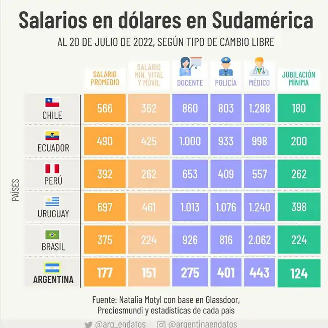 El salario promedio en nuestro país, neto de impuestos, está en torno a los U$S 177 si tomamos un dólar a $ 300. En ese sentido, plantea la economista Motyl, el sueldo de un docente se aproxima a los U$S 275 (tipo de cambio libre), el de un policía puede llegar a U$S 401 y el de un médico a U$S 443. “En tanto, en Uruguay ese un médico cobra U$S 1.240 y en Brasil en U$S 2.062. El sueldo de un policía en Chile asciende a U$S 803 y en Ecuador en U$S 933. Por último, el sueldo de un docente en Perú está en U$S 653, un 138% más que en nuestro país”, compara la experta.