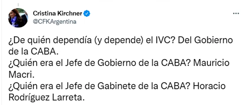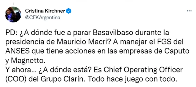 En esta serie de tuits, Fernández de Kirchner expresó: “¿De quién dependía (y depende) el IVC? Del Gobierno de la CABA. ¿Quién era el jefe de Gobierno de la CABA? Mauricio Macri. ¿Quién era el jefe de Gabinete de la CABA? Horacio Rodríguez Larreta”. “¿Quién era el Presidente del IVC que recibe las órdenes de Caputo? Emilio Basavilbaso. ¿Qué hacía Caputo, un empresario de la construcción, manejando y ordenando pagos del IVC? ¿Viste? Flojitos de papeles cobraron igual… con la tuya, contribuyente”, añadió la vicepresidenta. Y para cerrar su hilo remarcó que durante la gestión macrista, Basavilbaso fue designado para manejar el Fondo de Garantía de Sustentabilidad (FGS) del ANSES.