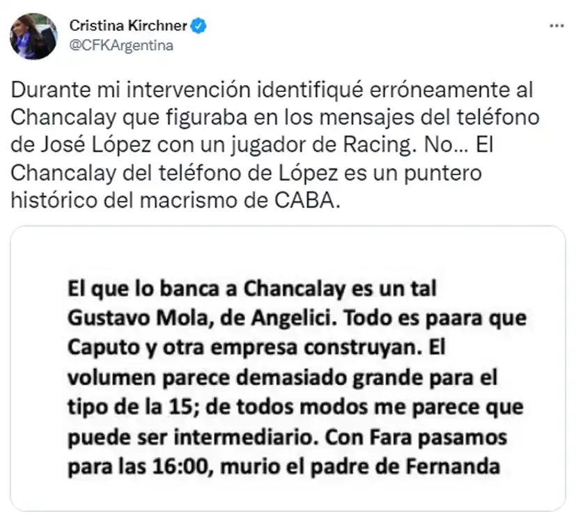 En este mismo sentido, la funcionaria leyó algunas conversaciones que intercambiaron José López y Nicolás Caputo, el empresario y “amigo de la vida” de Mauricio Macri, en diciembre de 2013 por el pago del soterramiento del tren Sarmiento. “La que se siente una boluda soy yo”, se molestó la vicepresidenta. Y exclamó: “La cotidianidad de las comunicaciones da una relación que me llama la atención que, con los criterios y los códigos que Luciani y Mola han examinado algunos hechos, no les llame la atención esto. ¿Lo habrá leído? Porque si lo leyó y no lo escandalizó, ojo. Se juntaron a comer, pero la jefa de la asociación ilícita soy yo”.